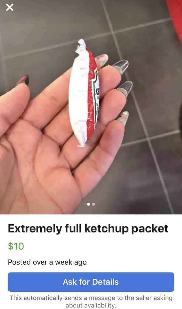 We have people selling ketchup packets for ten dollars. Ten American dollars! For a condiment that is dangerously bloated! It’s giving “botulism,” and not in a chic way. I don’t know who needs to hear this, but just because you own something doesn’t mean it has value. Sometimes, trash is just trash. Put it in the bin and stop trying to curate a storefront for your garbage.