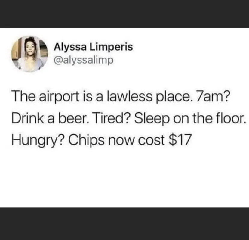 The airport tweet is a good place to start because airports are their own jurisdiction. Drinking beer at 7 AM feels both illegal and encouraged. Time doesn’t exist, money doesn’t matter, and you’ll pay $9 for chips without even blinking. Viral tweets are basically field notes from that zone.