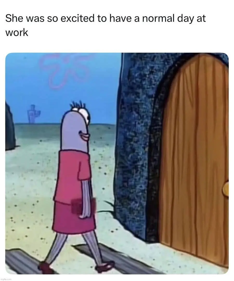 Then you’ve got the Spongebob fish walking into a door to represent having a “normal day” at work. It’s the jinx in one image. The moment you declare calm, chaos hears you and pulls up a chair.