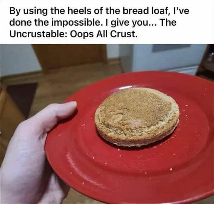 And the “Oops! All Crust” Uncrustable made from bread heels is culinary punishment. It’s not a snack. It’s penance. A meme dump should always include at least one food crime, and this one is doing hard time.