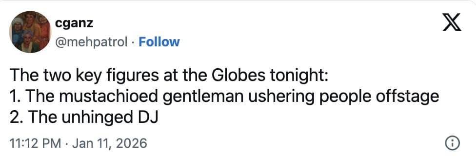 Which is a relief, honestly, because the Golden Globes reactions were doing their usual thing: champagne energy, slightly unhinged pacing, and the sense that the broadcast was one chaotic DJ choice away from turning into a wedding reception.
