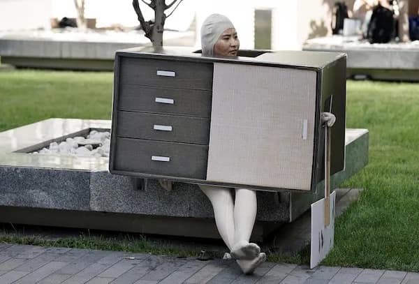 The dresser costume bench photo is elite because it’s committed nonsense. It’s not “outfit of the day.” It’s “I have become furniture.” If you’ve ever wanted to disappear in public without leaving, this is the blueprint.
