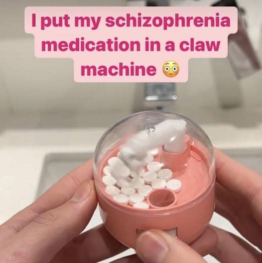 Then the meme dump hits you with the mini claw machine full of pills labeled as schizophrenia medication, which is dark in a very modern way. Turning “take your meds” into an arcade game is exactly the kind of coping-by-joke that keeps meme culture alive.