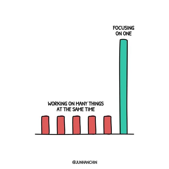 Then there’s the bar graph about doing many things versus focusing on one. It’s not even judging you. It’s just showing you what happens when you spread yourself thin: progress everywhere, but tiny. Focus on one thing and suddenly the bar is towering. It’s rude, but fair.