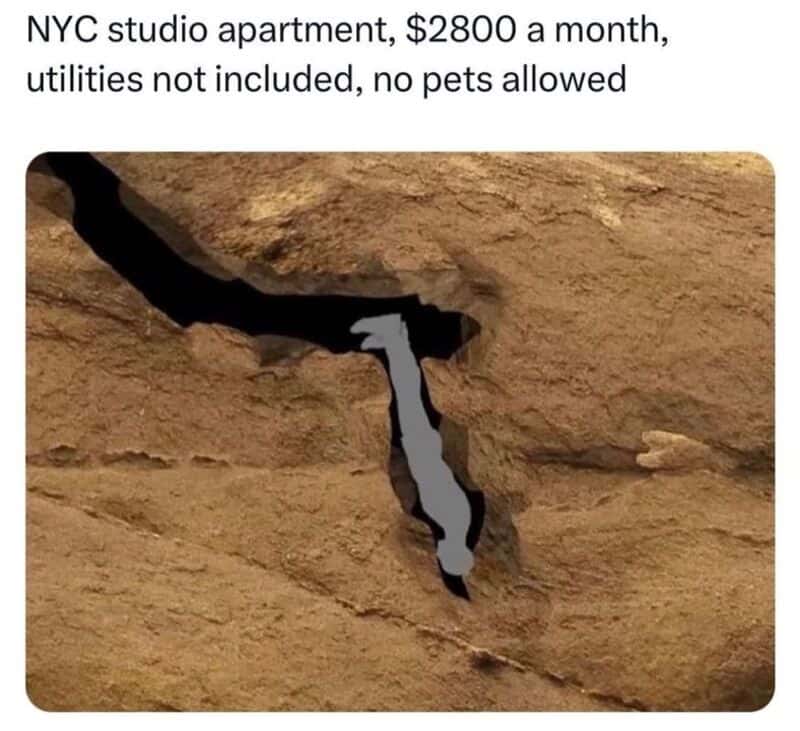 The “NYC studio apartment” rock crevice meme is also not even exaggeration anymore. It’s just the housing market doing improv comedy. Apartment memes always land because the prices sound like jokes, but they’re real.
