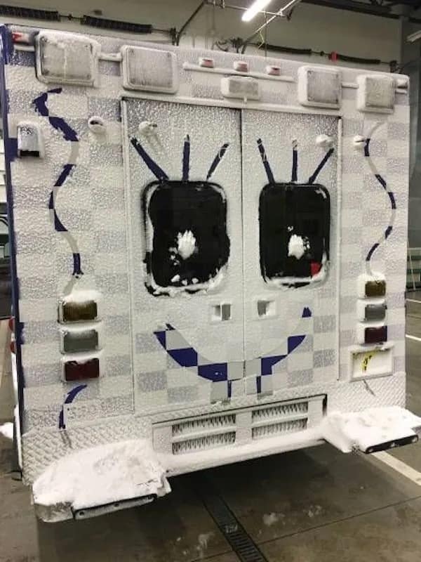 The snow-covered ambulance with a smiley face wiped onto the back doors is such a good opener because it’s unsettlingly cheerful. Like, why does the ambulance look excited to be working a blizzard shift? The little “eyelash” wiper marks make it feel like it’s flirting with danger.