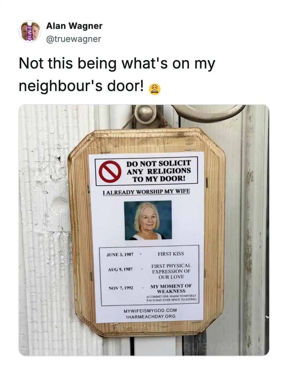 Then there’s the door sign warning solicitors that the resident already worships his wife, complete with a timeline and a “moment of weakness” in 1992. That’s not a sign, that’s lore. That’s a whole cinematic universe you’re forced to absorb before ringing the bell.