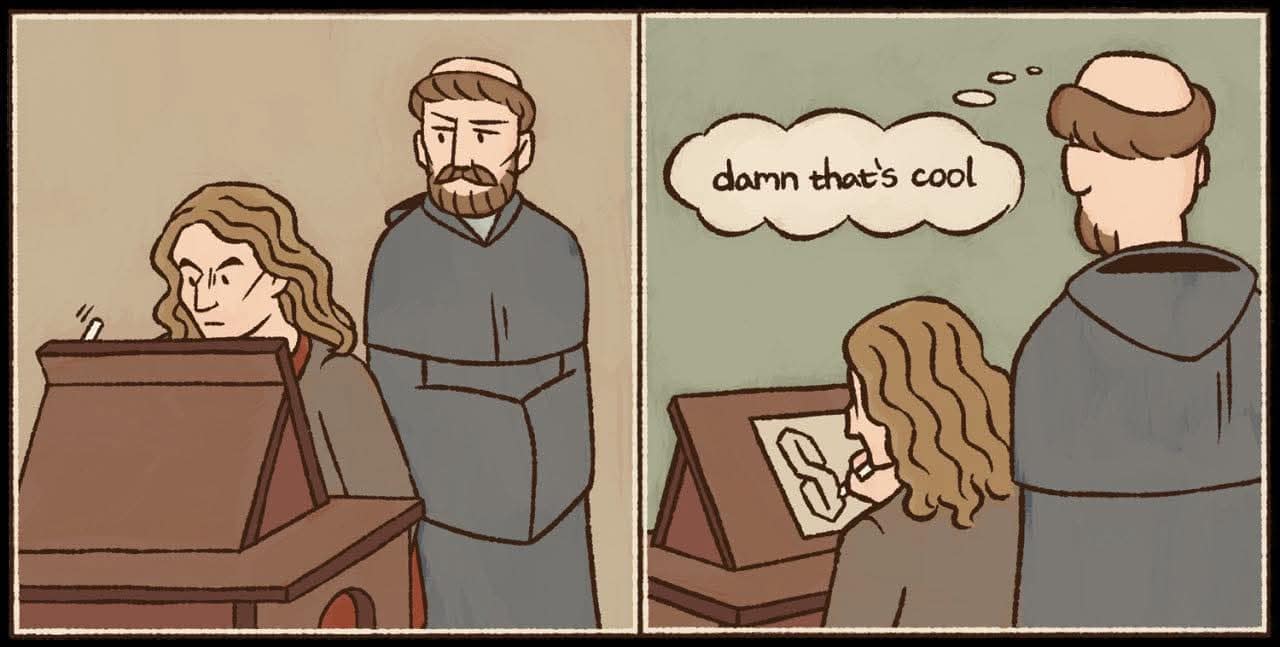 Also, the medieval monk being impressed by another monk drawing the Cool S? That’s the exact type of timeline glitch the internet craves. “Damn that’s cool” is apparently an ancient human instinct.