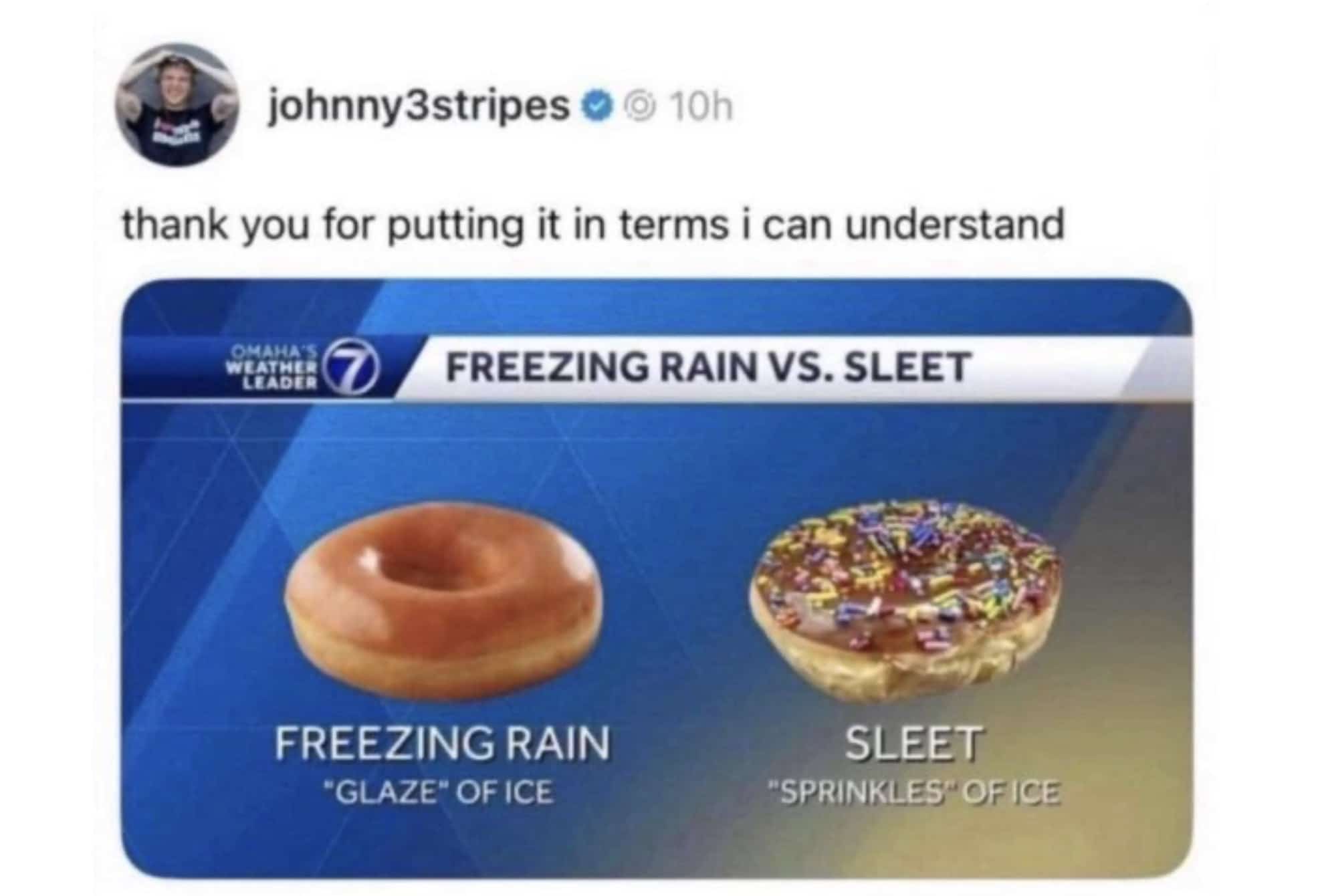 Weather news graphic using glazed and sprinkled donuts to explain freezing rain versus sleet.