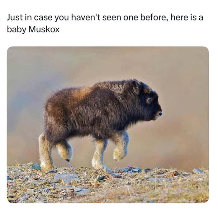 Gosh golly, look at them! I mean, seriously, look at them! The world is a scary place full of taxes and traffic, but then you see a baby muskox and everything is okay again! It is so fluffy! It looks like a cloud that decided to become a cow! I just want to squeeze it, but gently, because it is precious!