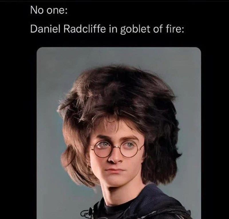 Then we’ve got the Goblet of Fire hair era. You know the one. Every teenage boy at Hogwarts collectively decided the barber was an enemy of the state. Daniel Radcliffe’s hair is so fluffy and dramatic it deserves its own credit in the opening titles. Harry Potter memes keep that era alive like it’s a sacred relic of millennial embarrassment.