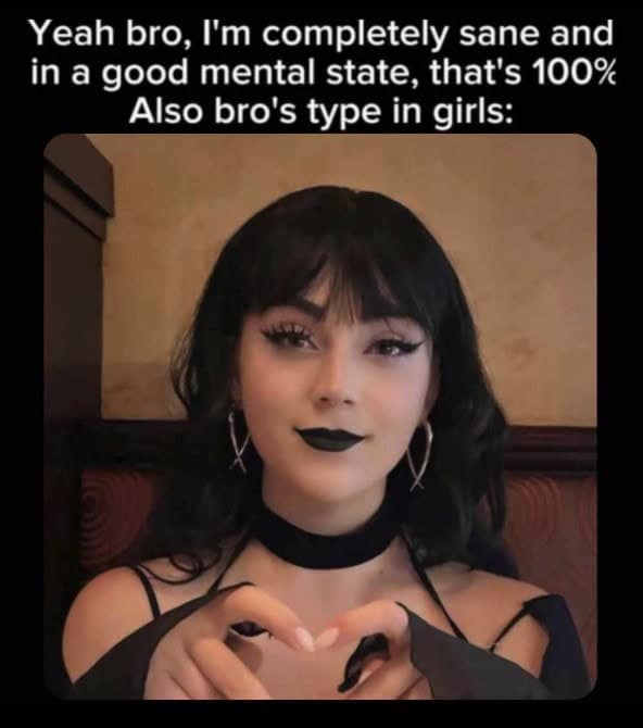 The “I’m completely sane” guy whose type is goth girls making heart signs is another perfect read. We all say we want stability, and then our heart is like, “Actually, I want someone who looks like they could curse my ex.” Relationship memes are brutally honest about that contradiction.