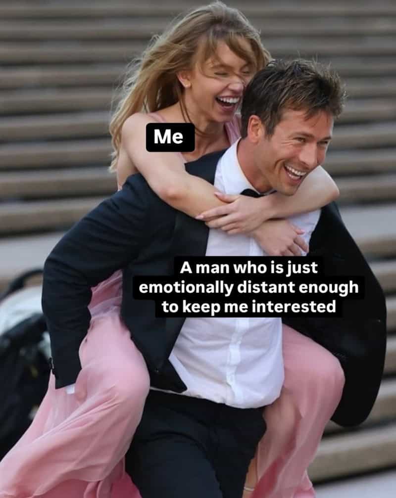 For the attachment-style damage section, the one about loving a man who’s emotionally distant “enough” is too real. Too available feels suspicious. Too absent hurts. The toxic sweet spot is apparently a guy who texts back in 6–10 business hours. Dating memes don’t invent these problems—they just put a caption on them and hand you a drink.
