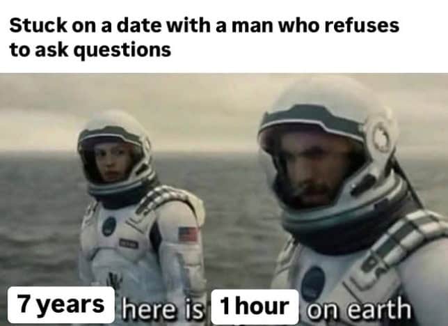 And the Interstellar time dilation meme about a date where the man asks zero questions? That’s the most accurate depiction of carrying a conversation solo. One hour feels like seven years. You emerge older, wiser, and slightly angrier.