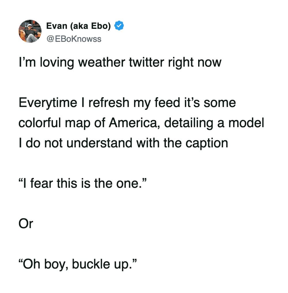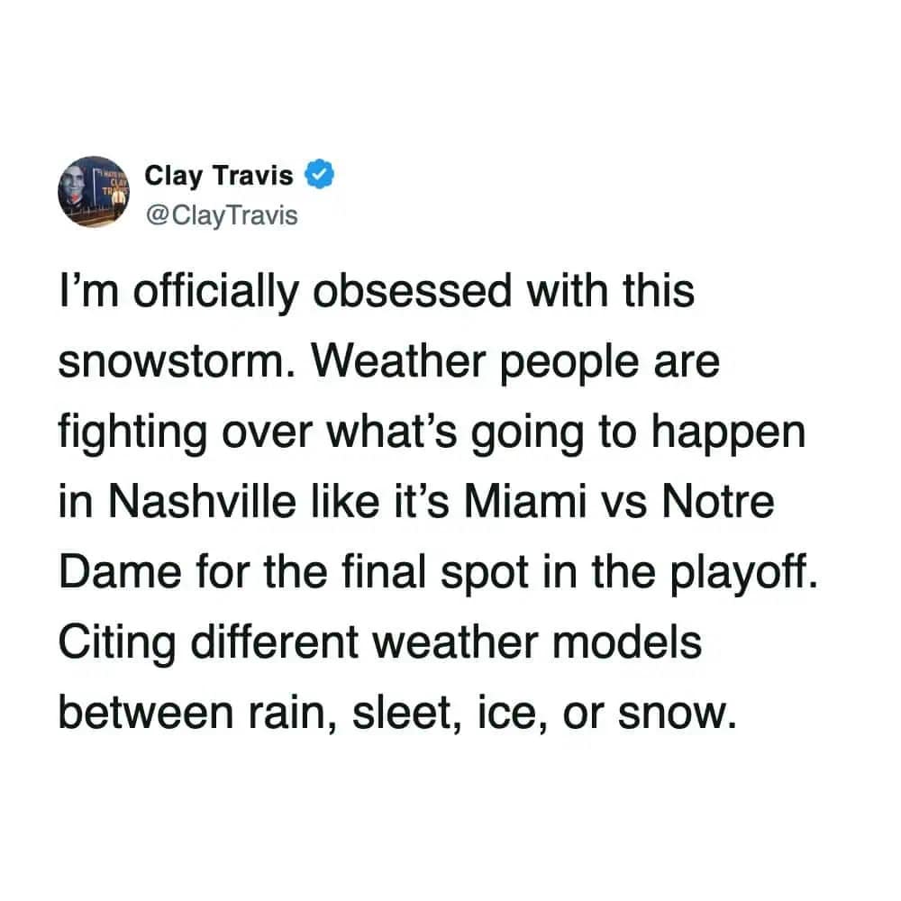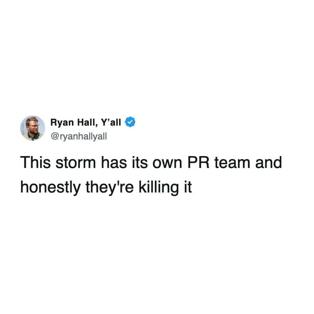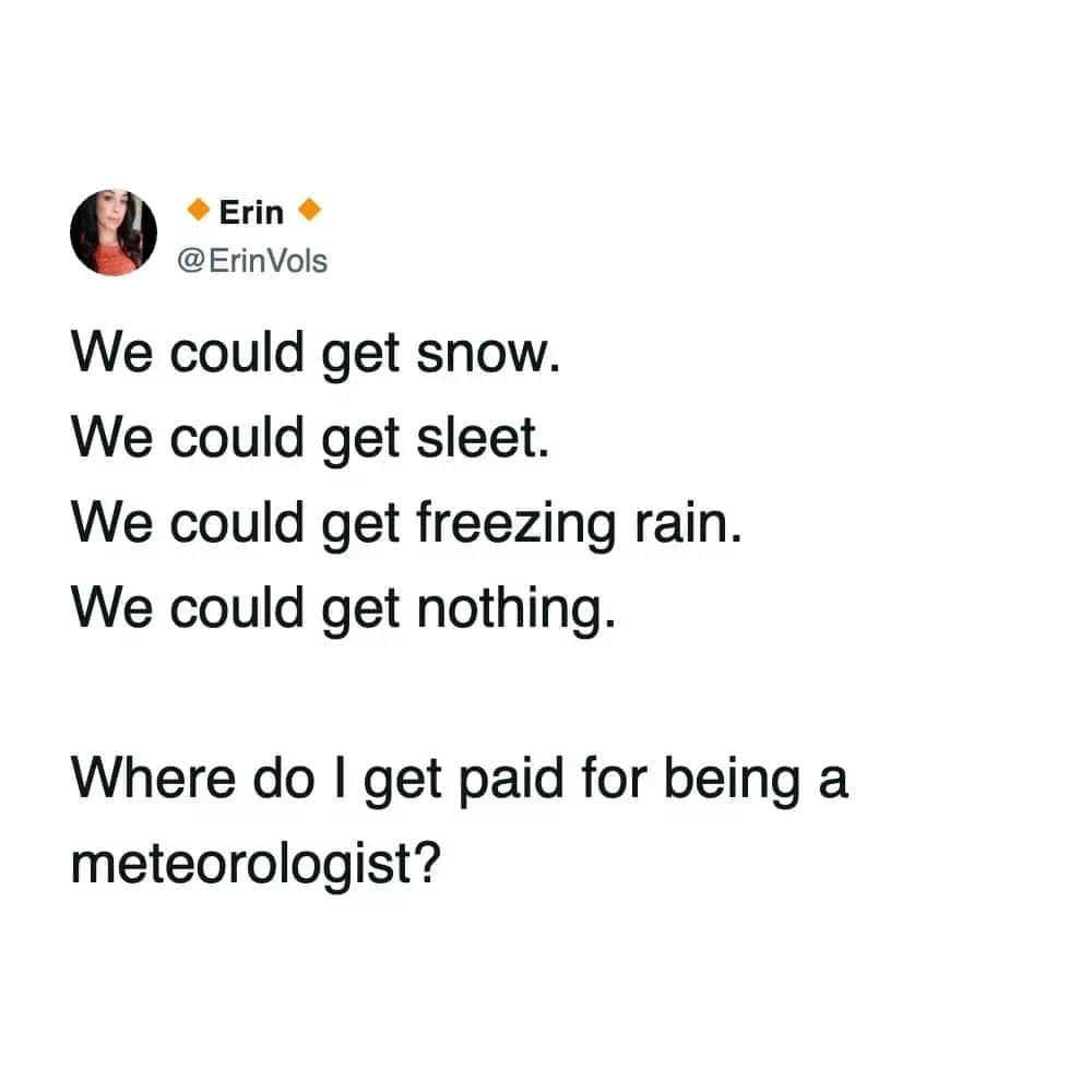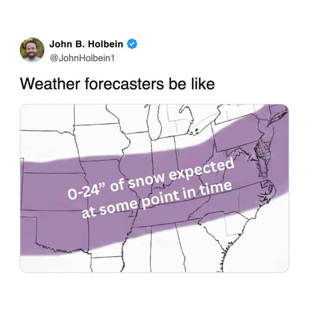 And the forecast range memes? Nothing bonds a community like being told you might get 1 inch or 31 inches. Cool. Helpful. Love that for us. Snowstorm memes like that are the only thing keeping us from screaming into a scarf.