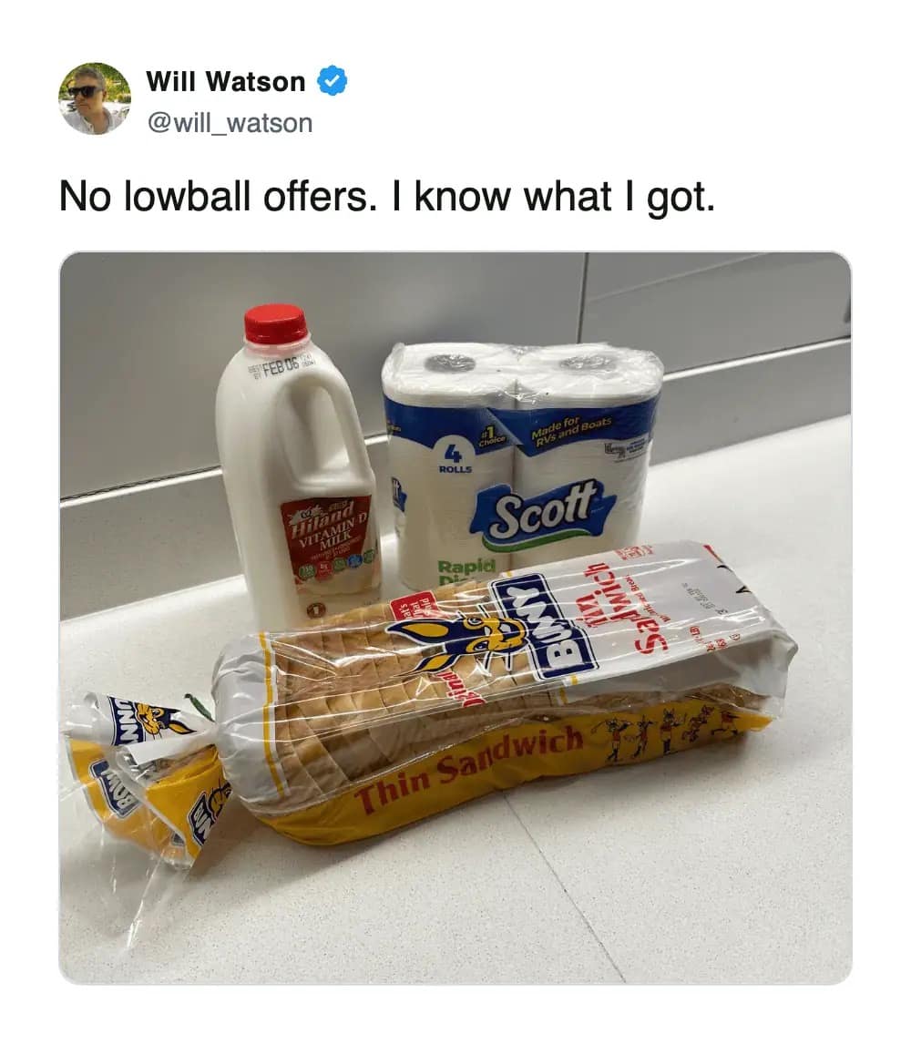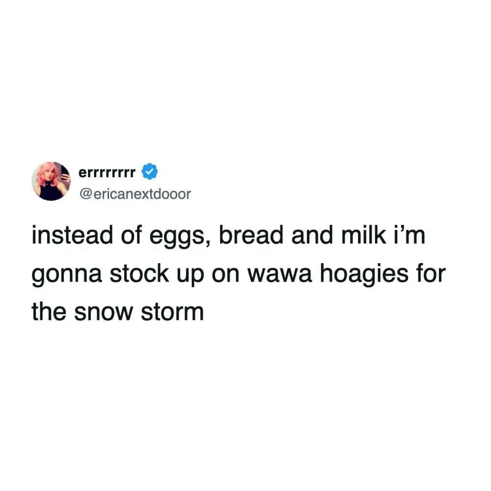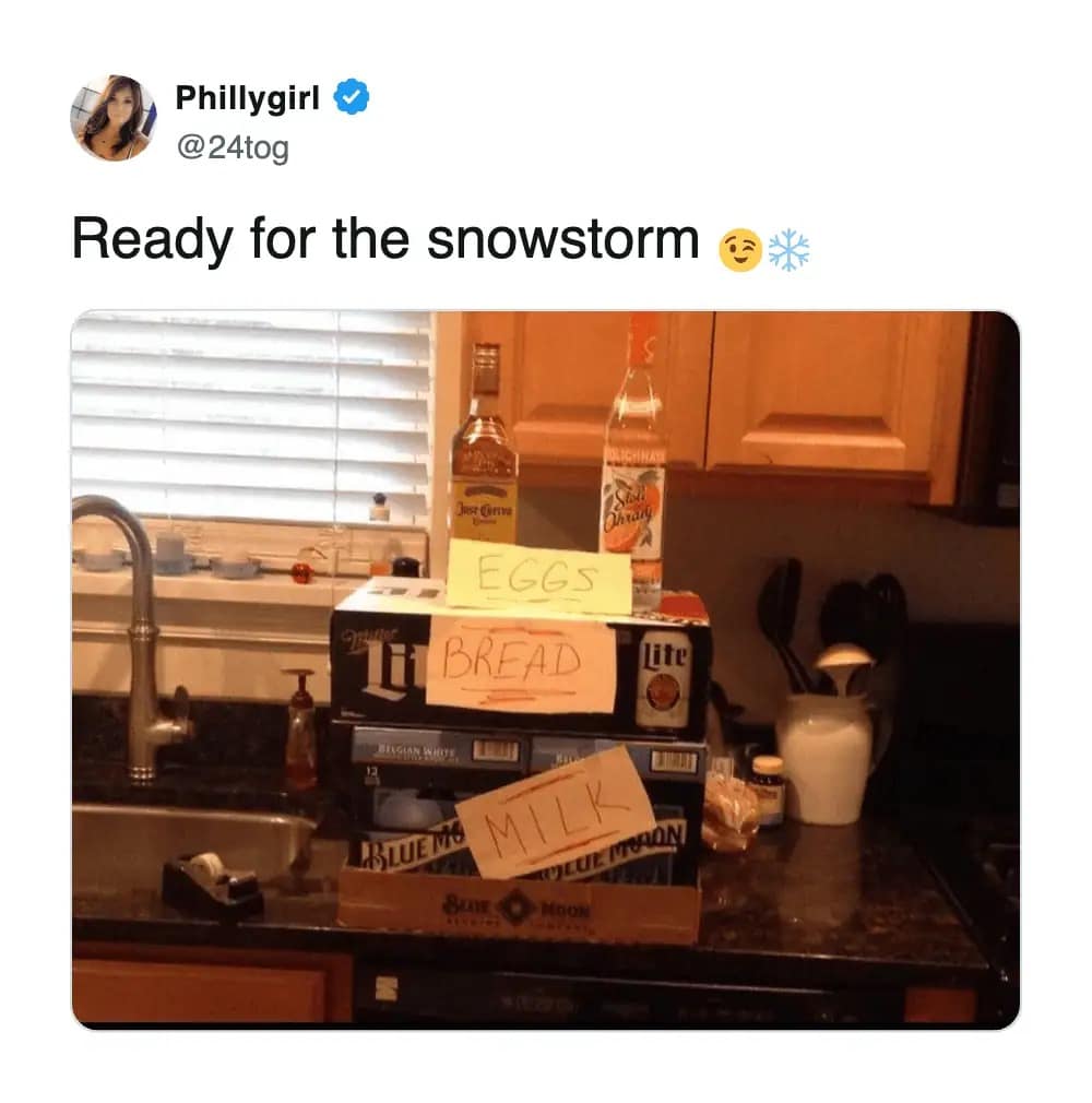 The storm shopping memes are also painfully accurate. People always joke about milk, eggs, and bread… but the carts in real life? Meat, cheese, cake, beer, muffins, beef sticks. That’s not panic-buying. That’s planning a tiny indoor party where the theme is “we tried our best.”