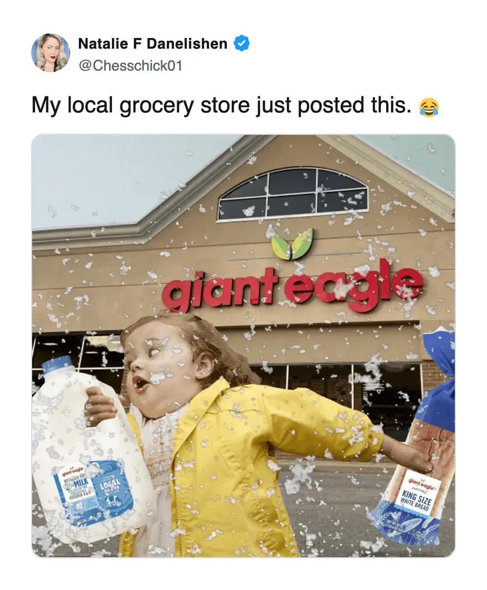 The storm shopping memes are also painfully accurate. People always joke about milk, eggs, and bread… but the carts in real life? Meat, cheese, cake, beer, muffins, beef sticks. That’s not panic-buying. That’s planning a tiny indoor party where the theme is “we tried our best.”