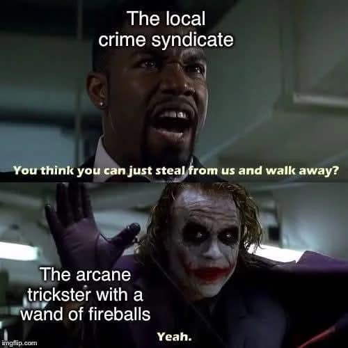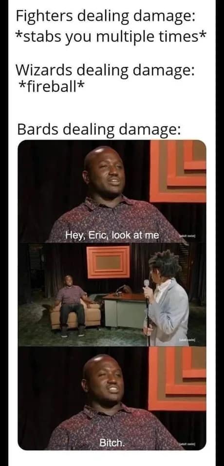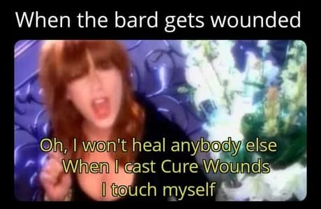 The Cure Wounds parody meme is the perfect example of party trauma. Because yes, healing is important… but the bard is also deeply committed to being the main character. If someone bleeds out while the bard self-heals dramatically, that’s just immersive storytelling.