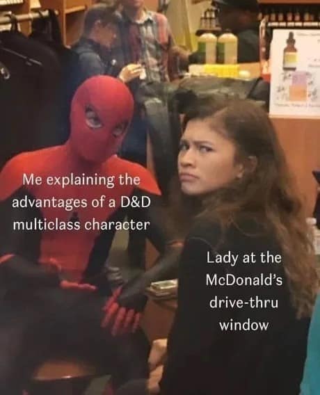Then there’s the Spider-Man drive-thru multiclassing meme, which is basically every D&D player’s inner monologue. You don’t want to explain your build. You need to explain your build. The drive-thru worker did not ask, but you’re about to give a TED Talk about synergy anyway.