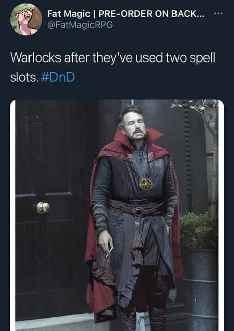 Ben Affleck smoking as a warlock out of spell slots is so real it hurts. Two spells. Gone instantly. Now you’re a stressed little guy with a cantrip and regrets. Short rest? More like emotional recovery break.