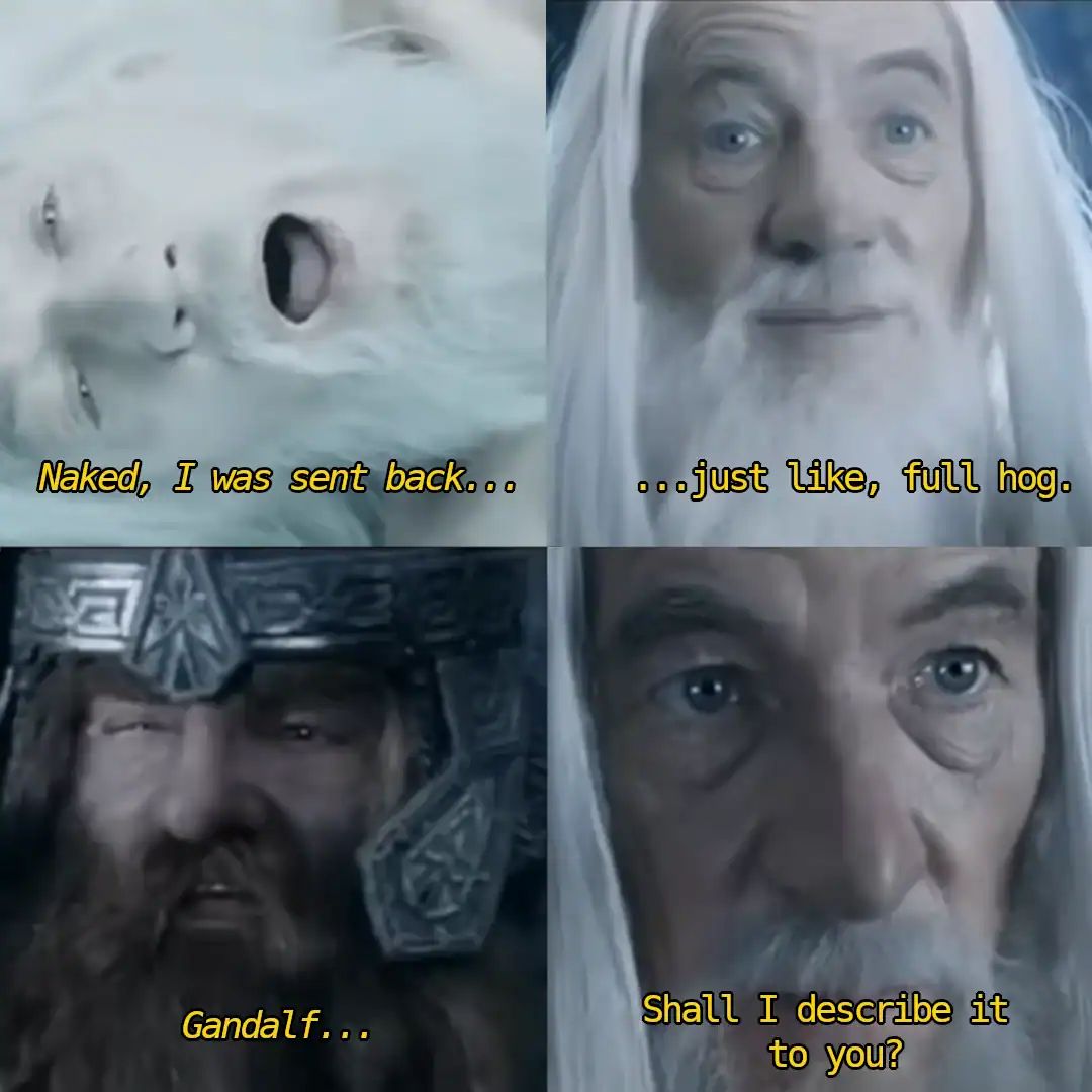 And the Gandalf hitchhiking LoTR meme is so funny because it’s weirdly believable. Like yes, the Grey Pilgrim absolutely looks like the kind of man who would appear on the side of a rural road and you’d think, “I have exactly one chance to do something heroic today.”
