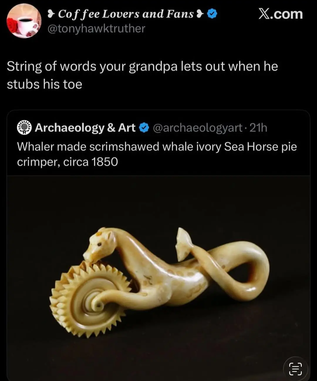 And the meme with the grandpa-stubbing-his-toe language represented by a jagged 1850 whale ivory pie crimper? That’s poetry. That’s museum-grade suffering. That’s your older relative inventing new syllables in real time.