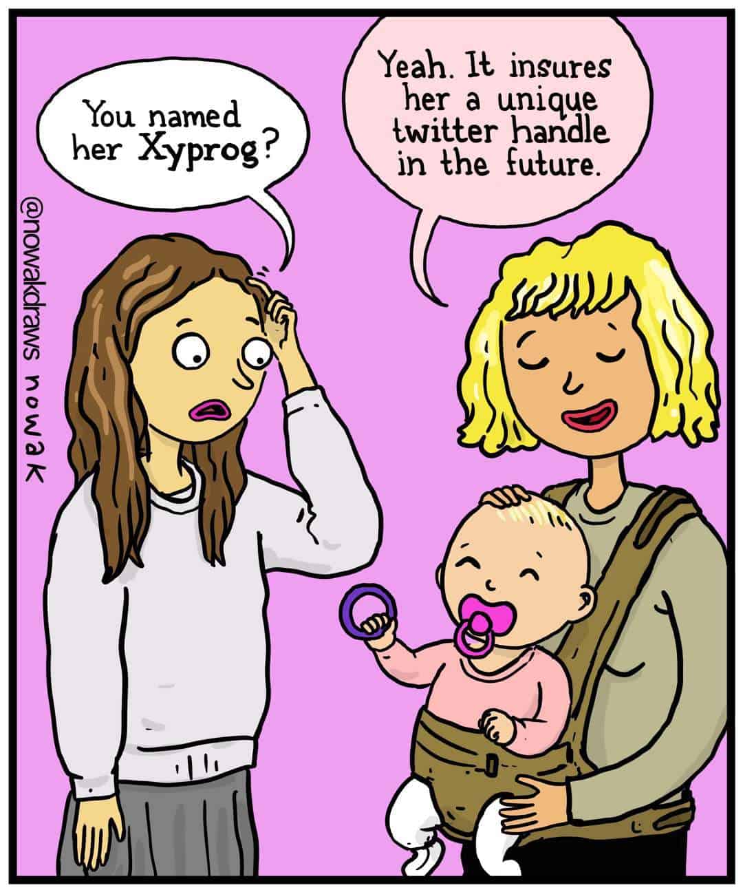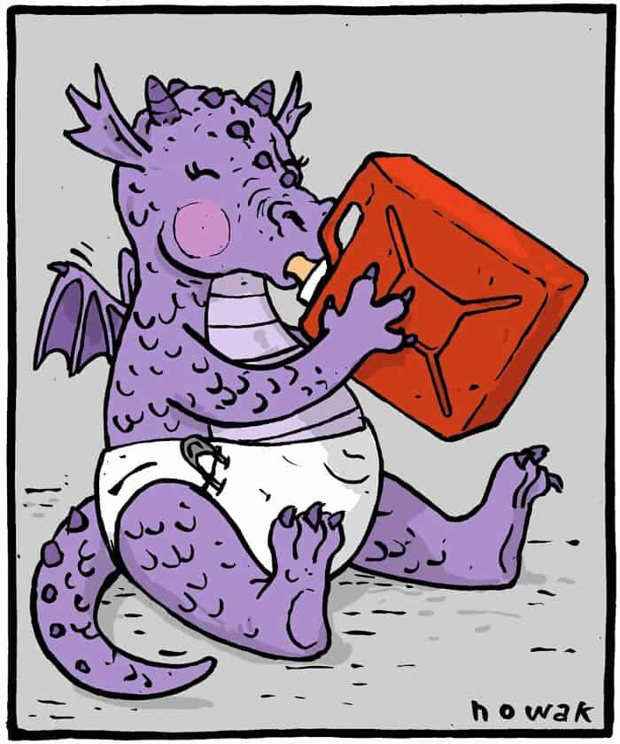 The baby dragon chewing on a gas can like it’s a teething toy is another perfect Nowak move: adorable on the surface, catastrophic underneath. It’s the parenting genre, except the baby is a medieval hazard.