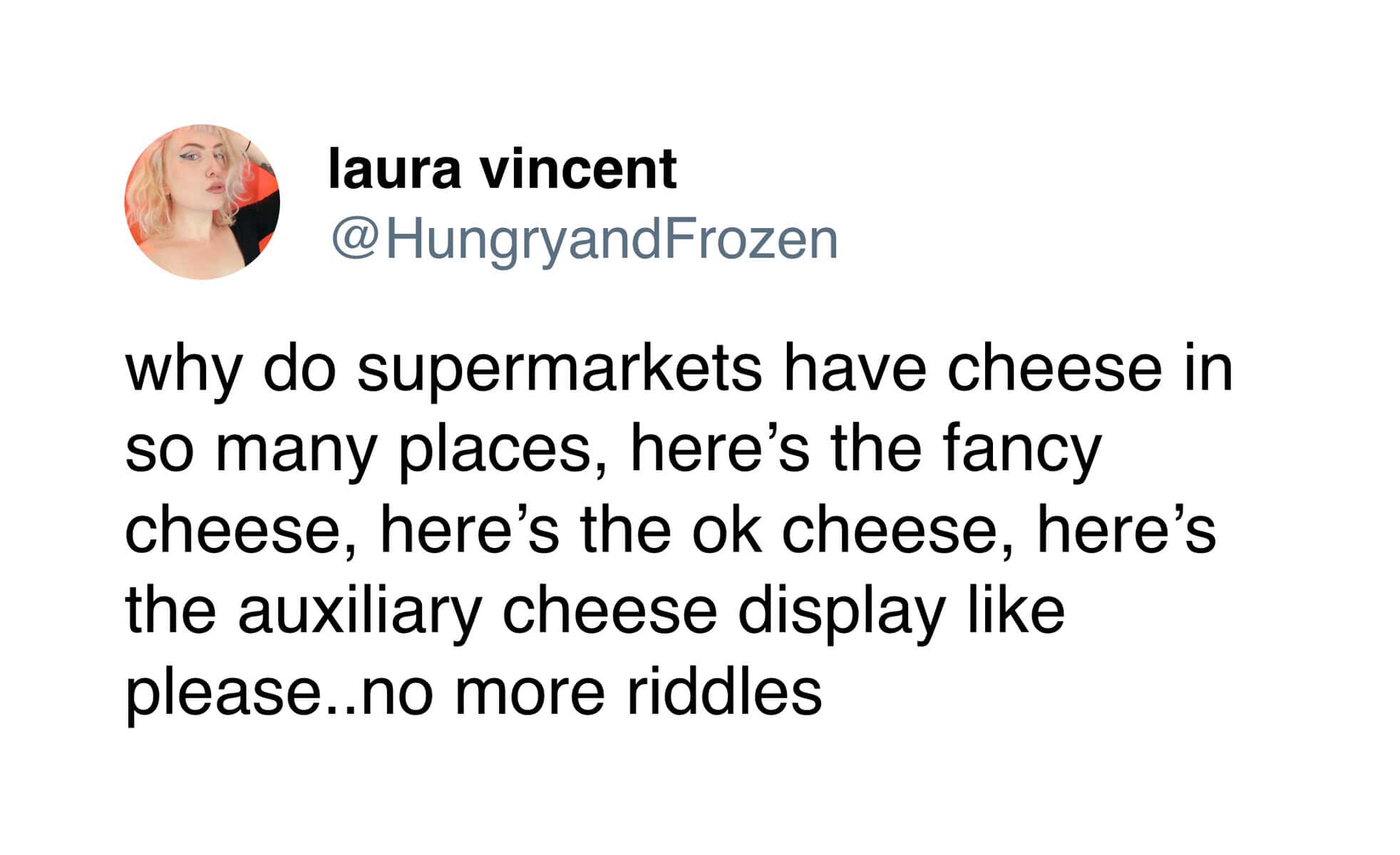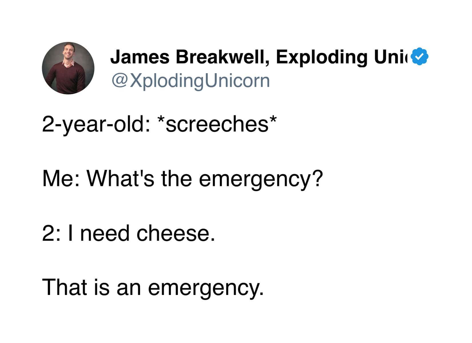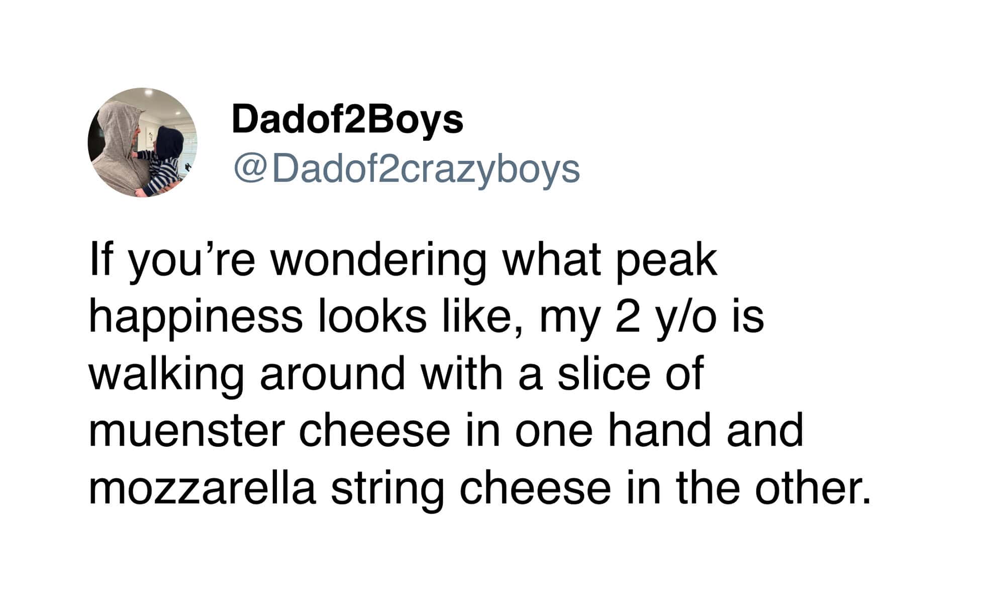 Toddlers, though? Toddlers understand cheese. The two-year-old declaring a cheese shortage to be an emergency is correct. That child is running a tight ship. A household without cheese is basically a crisis management scenario.