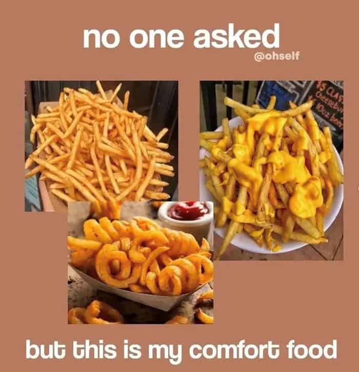 Let’s not ignore fries being labeled “comfort food,” because yes. Potato-based therapy is real. Curly, crinkle, cheesy, whatever. French fries are the friend who always shows up.