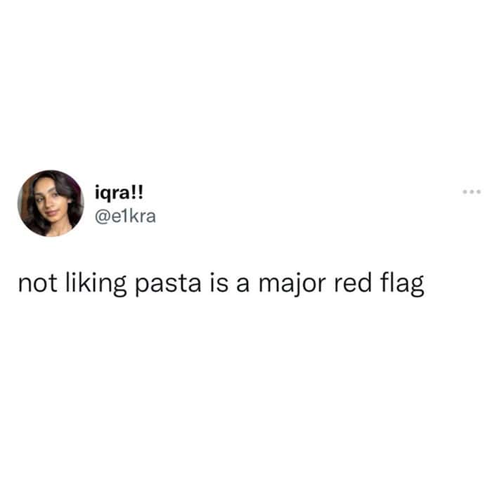 Also, the pasta red flag tweet is hilarious because it’s so dramatic. Not liking pasta isn’t a crime, but it does raise questions. Food memes love a harmless dealbreaker. Let people be passionate.