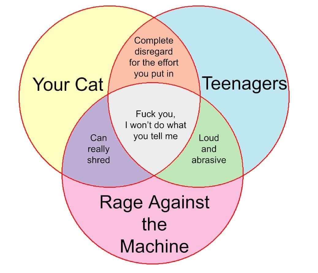 The Venn diagram connecting cats, teenagers, and Rage Against the Machine is honestly a perfect piece of research. Same message, different packaging: “I won’t do what you tell me.” Funny memes don’t need to be complicated when the premise is already accurate.