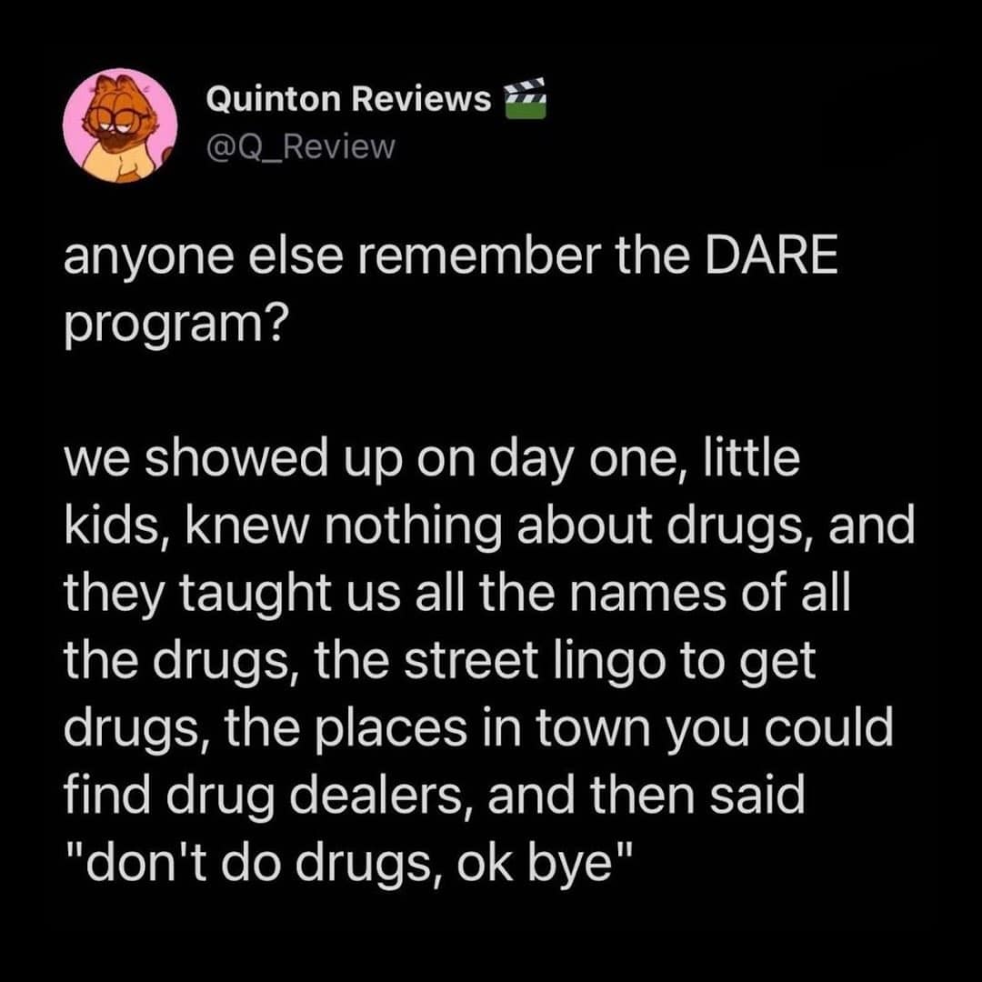 The DARE tweet is a classic reminder that a lot of the 90s was basically: “Here’s a detailed list of things. Don’t do them.” Great plan. No notes. Meme dump content like that hits because it’s the perfect combination of obvious and forgotten.