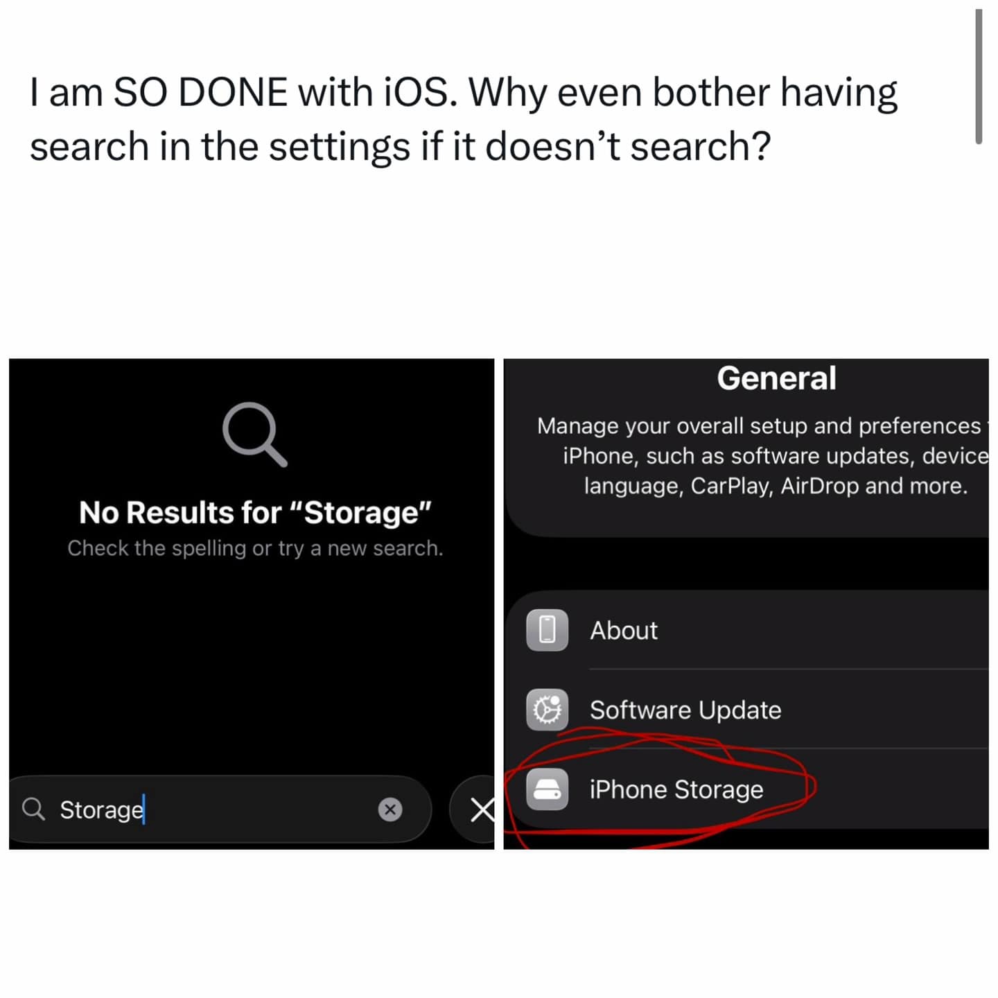Tech frustration gets a seat too: searching “Storage” and getting nothing while “iPhone Storage” is right there. Software search bars are tiny gaslighters. Relatable memes don’t have to exaggerate—they can just show you your daily argument with a settings menu.