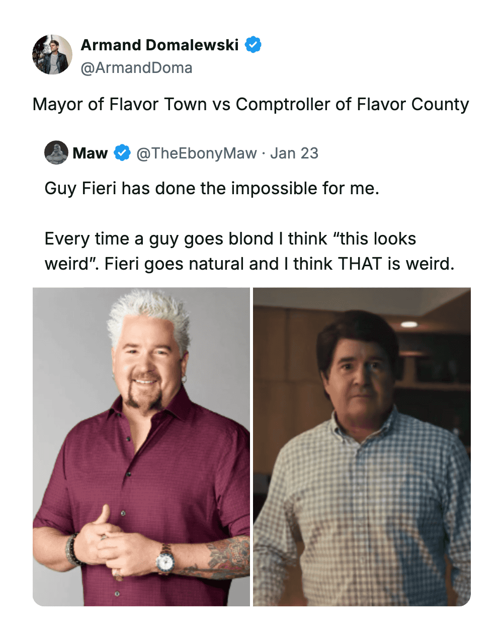 The Guy Fieri hair roast is elite because it doesn’t just describe him—it assigns him a bureaucratic title. “Comptroller of Flavor County” feels like a job with benefits and a laminated badge. Viral comments always win when they commit to a dumb premise all the way.