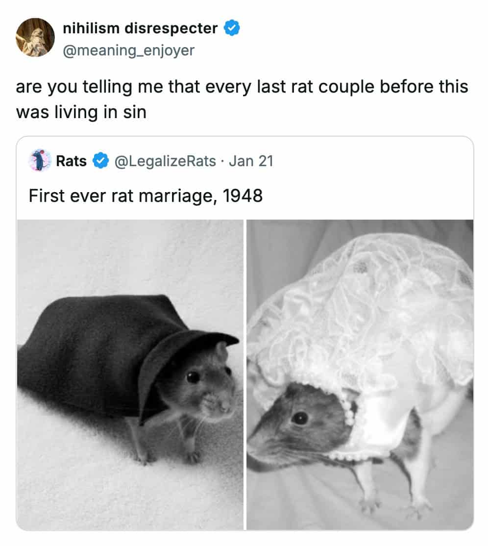 And the rat marriage theology question is peak internet brain. Someone sees a cute historical post and immediately invents a moral crisis for rodents. That’s the comment section’s real mission: take nothing seriously, except the bit.