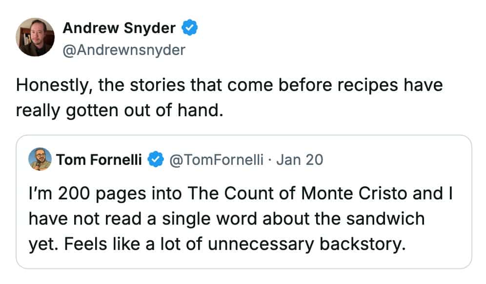 And the food blog thread comparing recipe backstories to The Count of Monte Cristo? That’s a universal pain. Nobody needs your emotional origin story to make banana bread. Just give us the measurements before we perish.