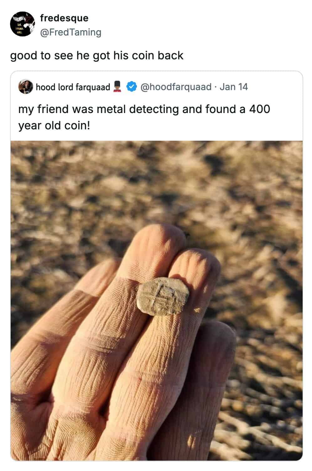Also: “good to see he got his coin back” about the wrinkled hand is so rude and so clean. Some viral comments feel like a professional roast written in under three seconds. Terrifying talent.