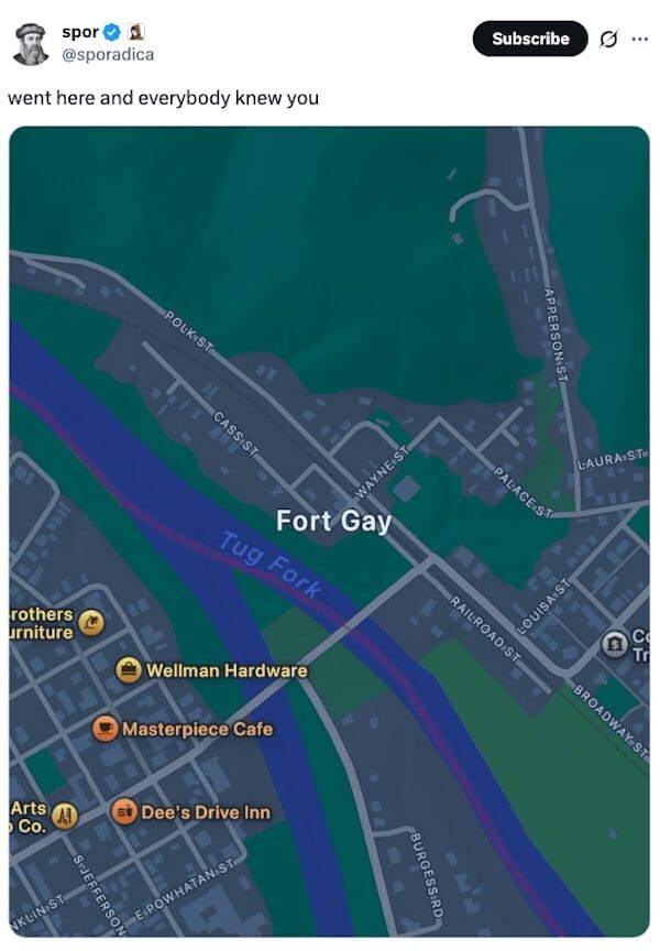 Google Maps pin located on a town named Bummerville with viral tweet caption.