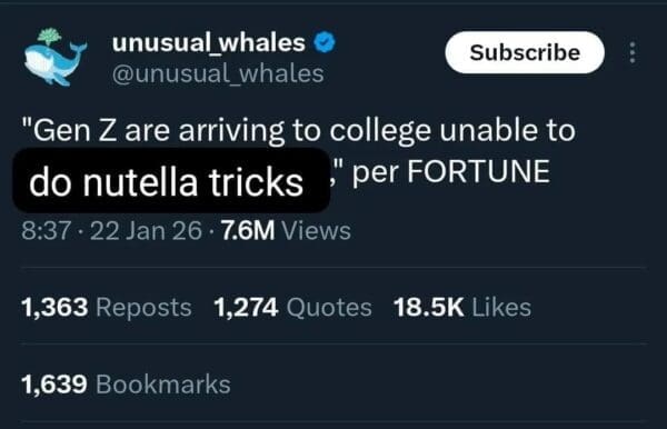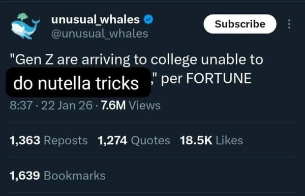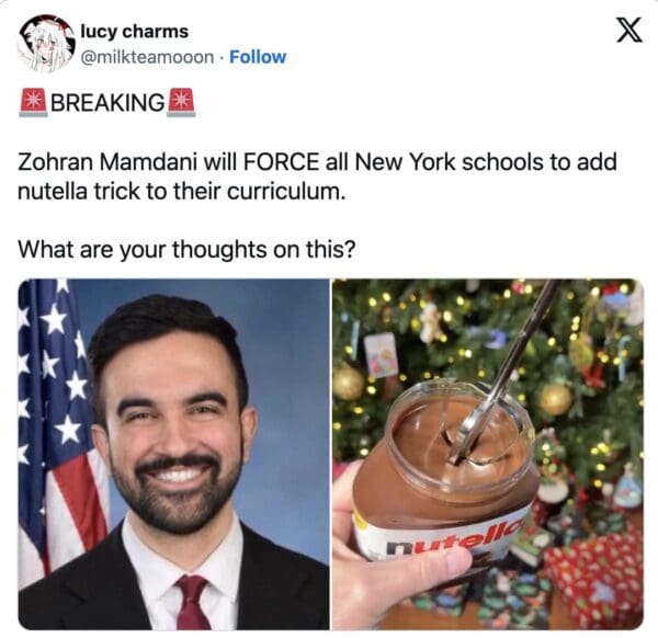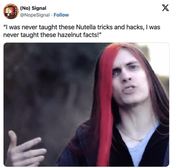 The original spark was a viral clip about using a mixer in a jar of Nutella to soften/whip it, posted with the caption “Nutella tricks you’re never taught in school,” and the internet responded the only way it knows how: by building lore.