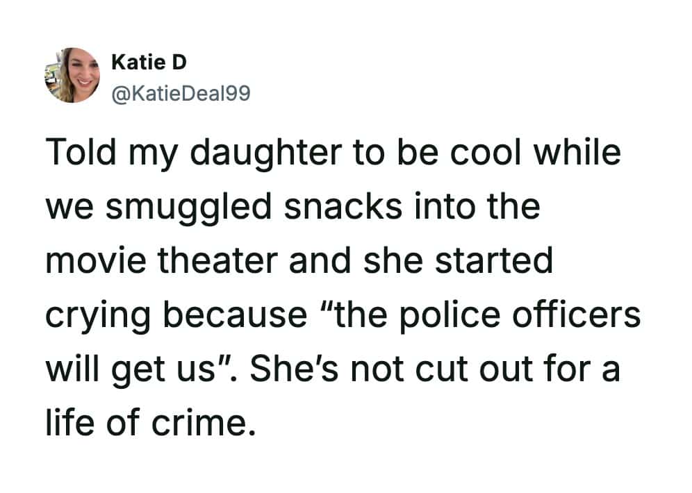 There’s a special kind of comedy in how kids treat rules like folklore. Movie snack “smuggling” becomes a full-on crime thriller in their minds, while you’re just trying to save $19 on popcorn. Then you look up and realize your child has leveled up from candy to a full deli situation. That’s not rebellion. That’s innovation.