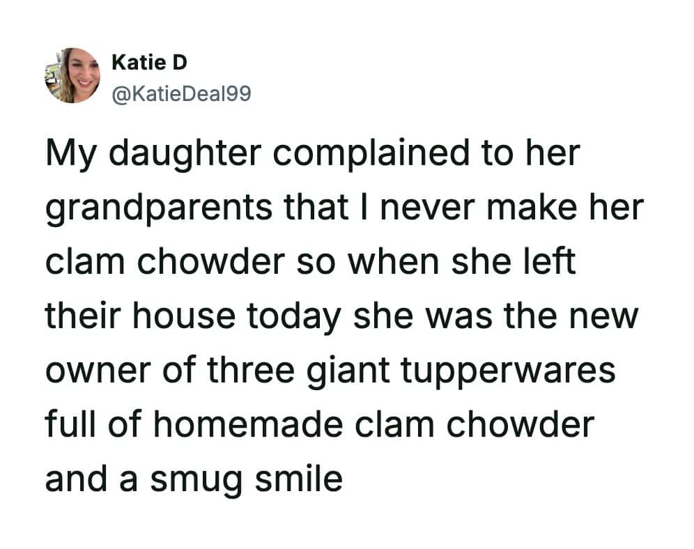And the generational whiplash in these funny parenting tweets is perfect. You go to vent, and your own mom hits you with a look that says, “I know exactly why your kid is like this.” Meanwhile, grandparents are out here playing the long game—sending your child home with an unreasonable quantity of chowder like it’s a flex.