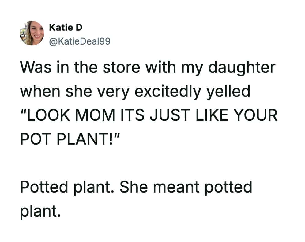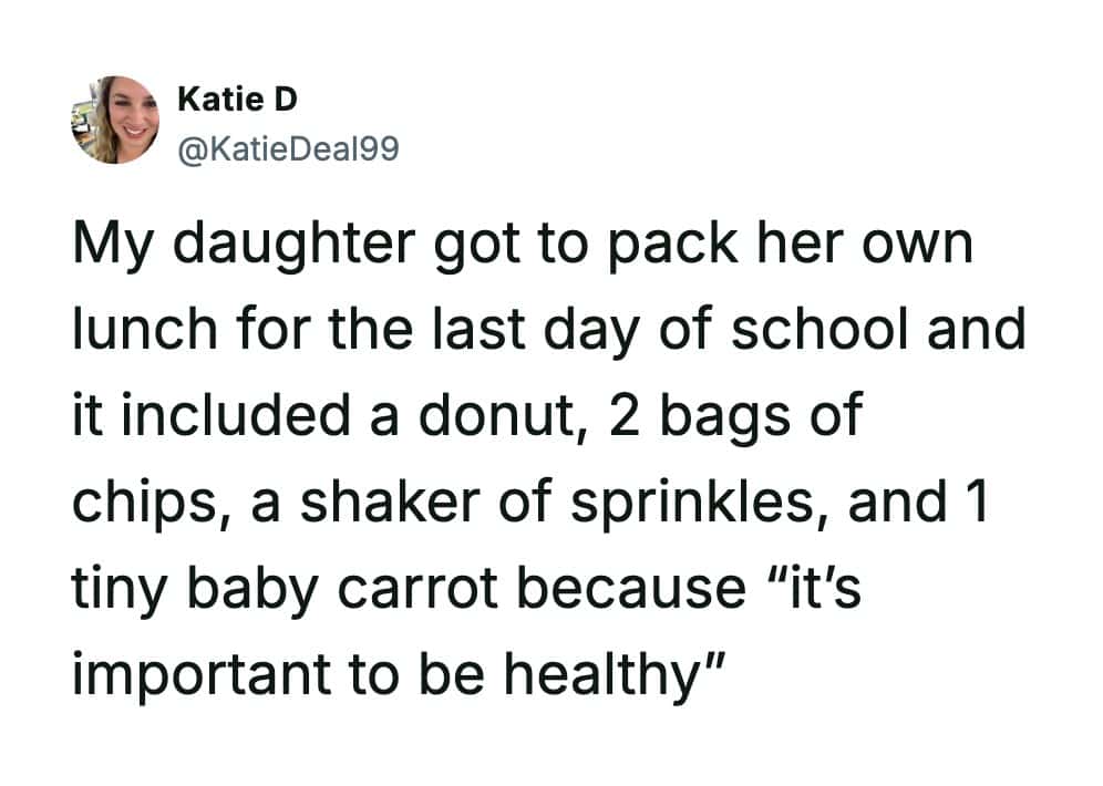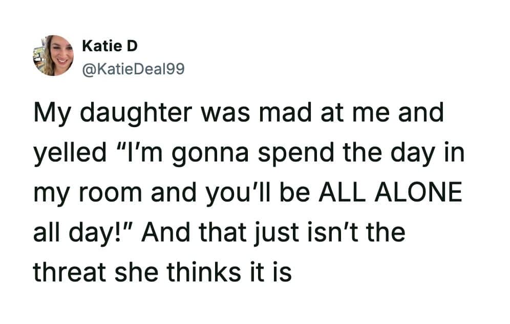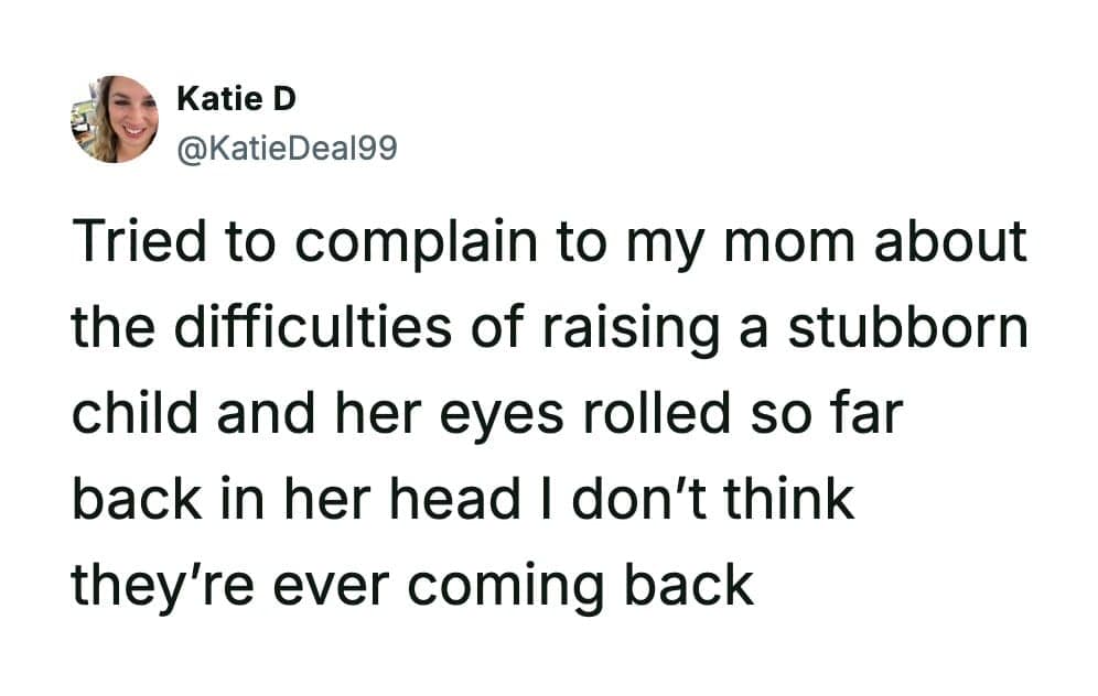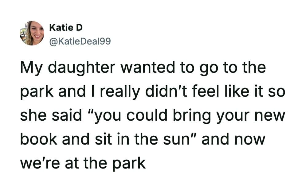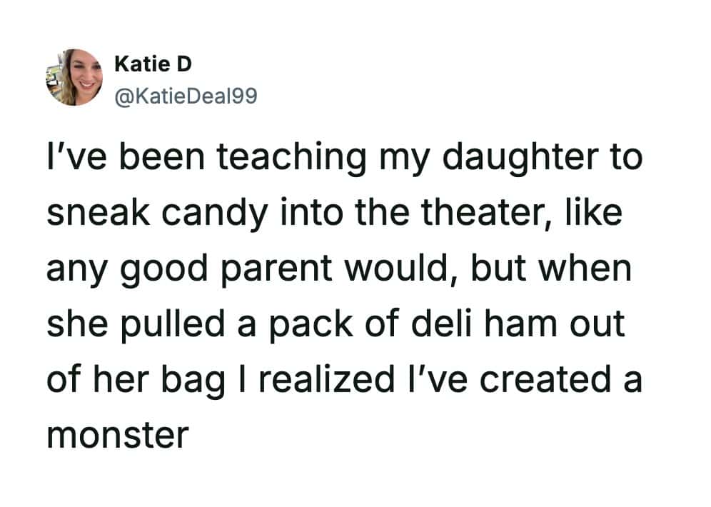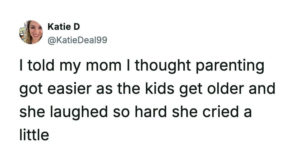 Funny parenting tweets are basically tiny documentaries about raising kids in public, in private, and in the 30-second gap between “everything’s fine” and “why is there ham in your backpack.” Katie D has a gift for catching those moments right as they tip from wholesome to absurd.