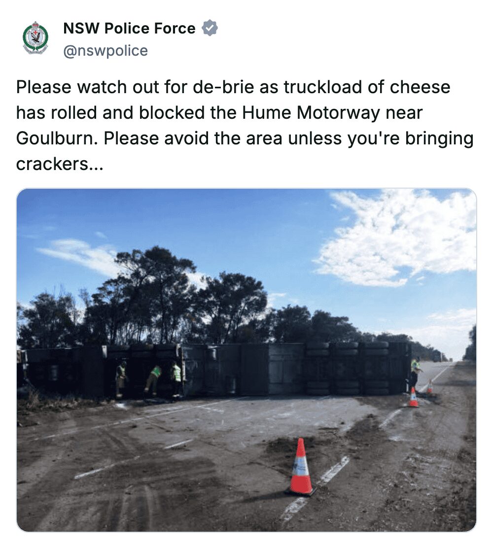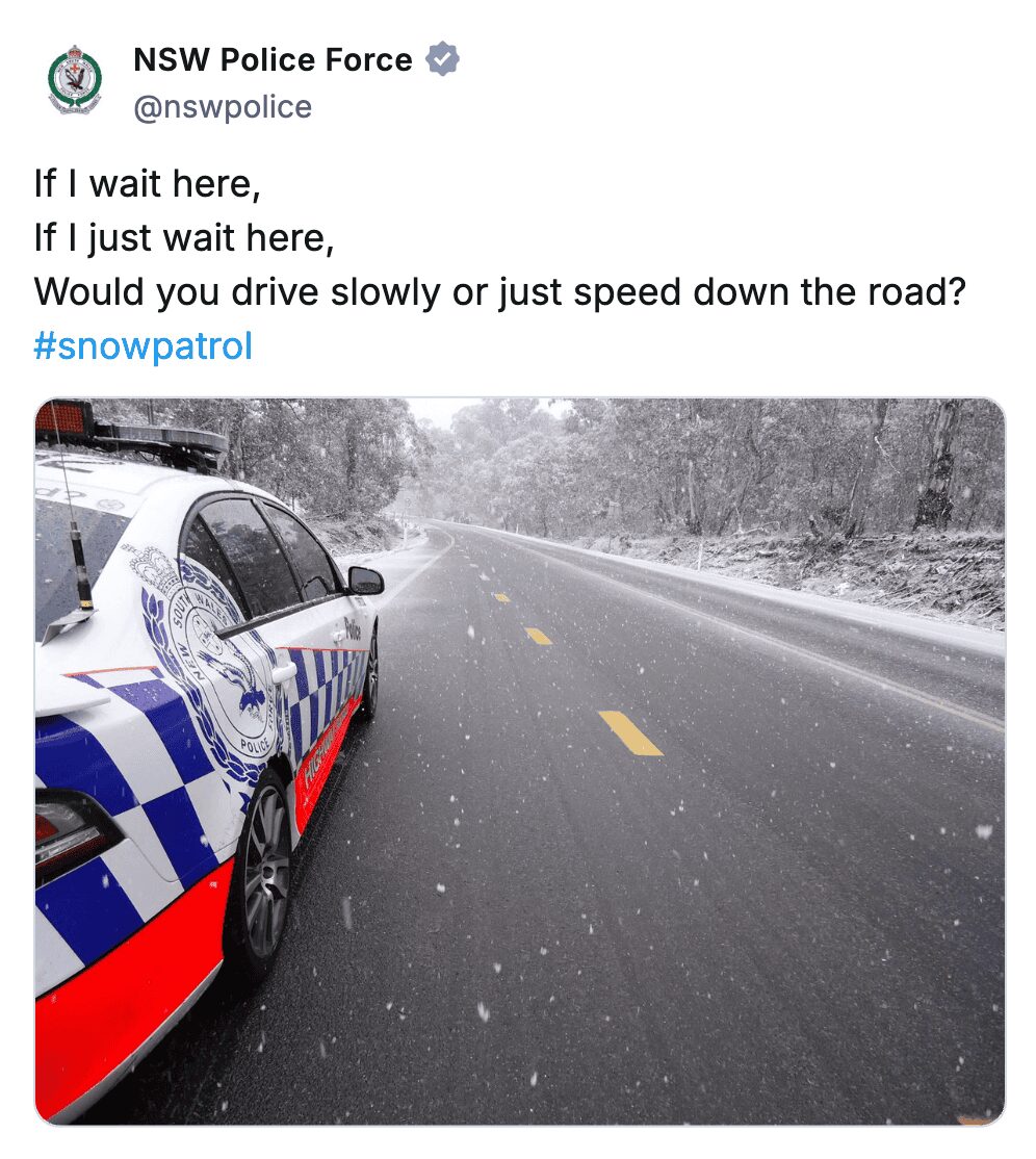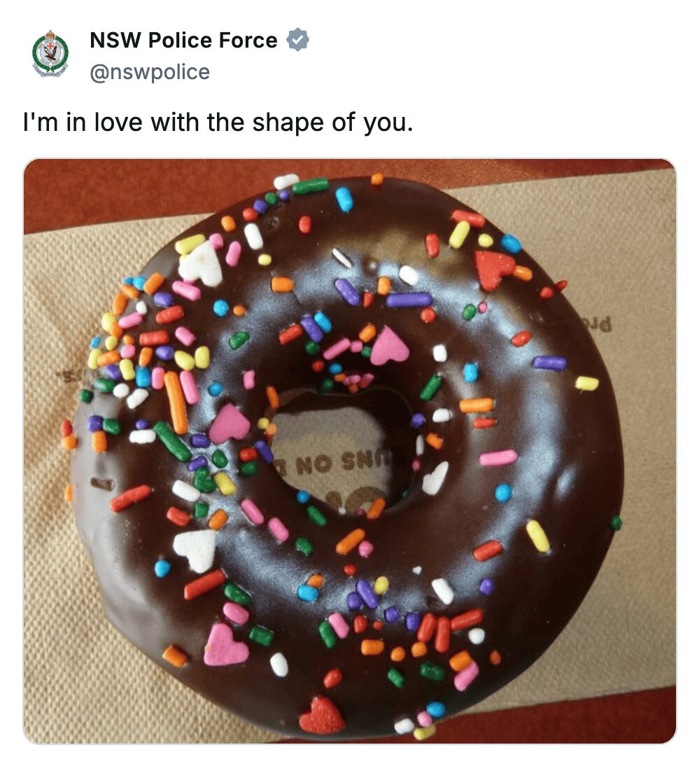 The Lee’s Summit post is savage. Roasting a party host for low engagement? That is police brutality of the emotional kind! And the NSW Police leaning into the donut stereotype with Ed Sheeran lyrics? That is how you build bridges with the community. One sprinkle at a time.