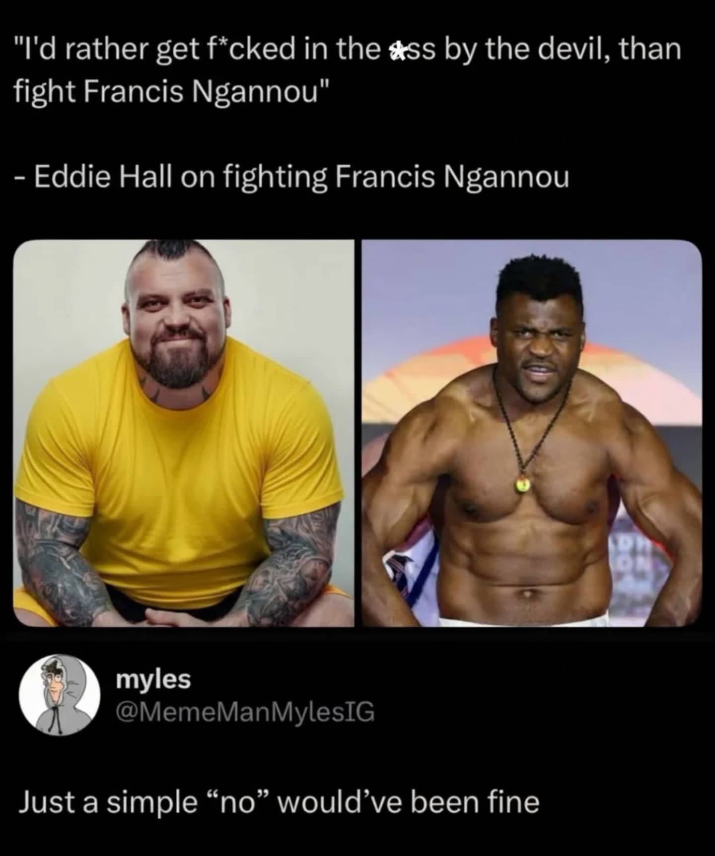 Boxing meme showing Andy Ruiz Jr. labeled as people who do drugs at Applebee’s defeating an athlete.