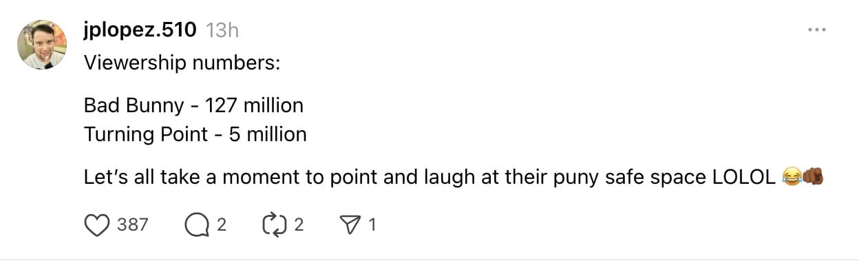 A big chunk of MAGA halftime show memes leaned on the simplest comedy math: “You said this was the real party, but the views say otherwise.” Whether those screenshots were perfectly accurate or just vibes with a calculator, the joke was clear: attention is the only scoreboard the internet respects.
