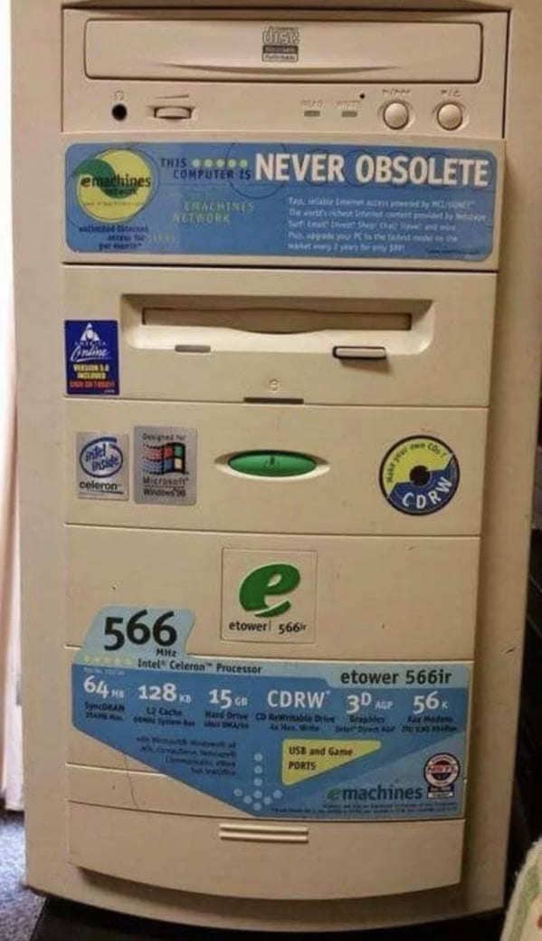 The “Never Obsolete” computer sticker is the funniest thing I have ever seen. Everything is obsolete eventually! Especially beige towers from the 90s. And the wedding date tattoo? A disaster. Just write it on a post-it note! Why do we need to inject ink into our skin to remember a date that hasn’t happened yet?