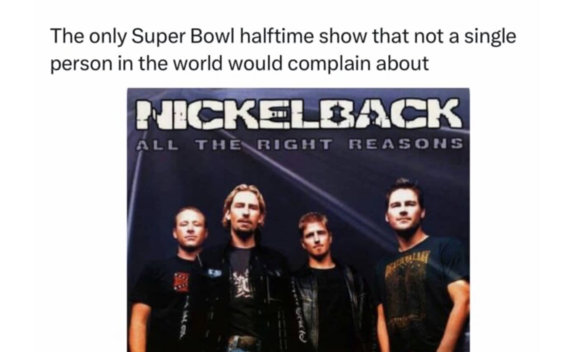 The band Nickelback on their "All the Right Reasons" album cover with a Super Bowl caption.