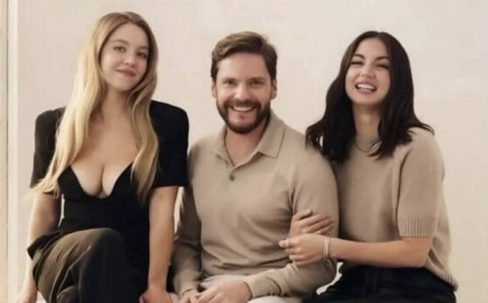 Humorous wish fulfillment meme featuring actors Sydney Sweeney, Daniel Bruhl, and Ana de Armas.