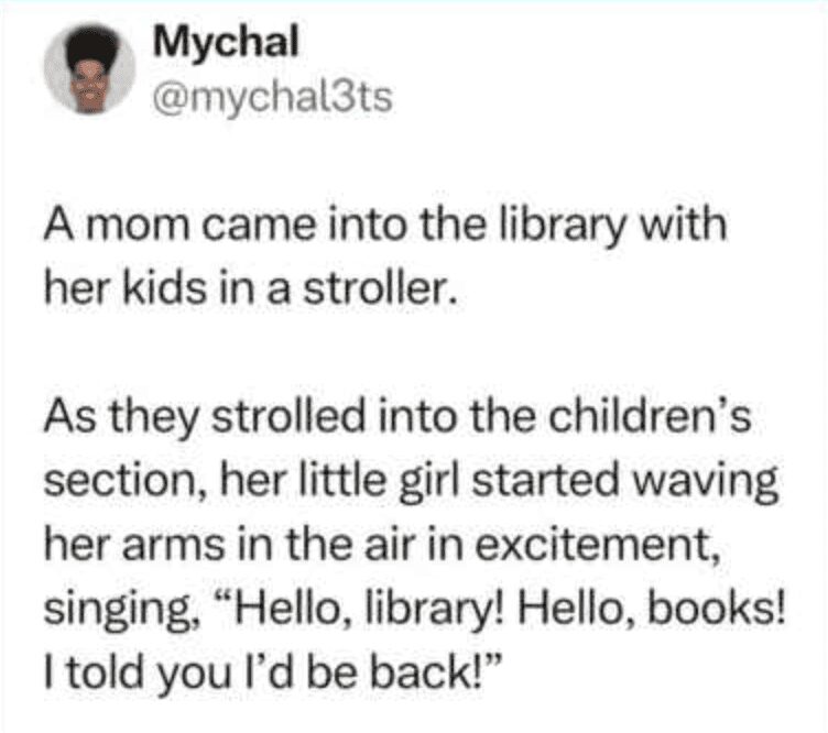 The tactical ways children use reading to manipulate their parents are actually brilliant. My daughter convinced me to go to the park just because she suggested I could read there. She is a genius and I am clearly a pushover. These book tweets capture that inner monologue perfectly. From the romanticism of a home library to the reality of moving it, we are all just living in a literary montage. If you have a stack of books on your nightstand that is taller than you are, you are doing great.