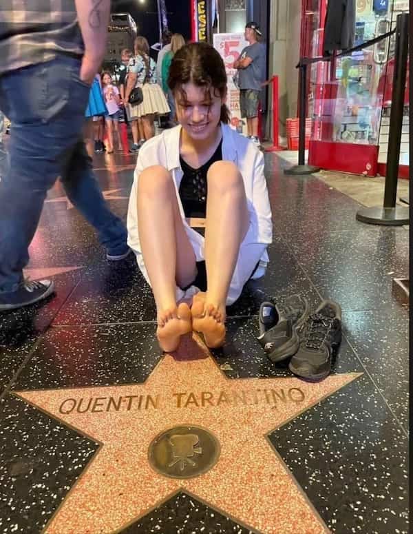 Actress Sydney Sweeney wearing glasses and a white t-shirt with a humorous social media caption.